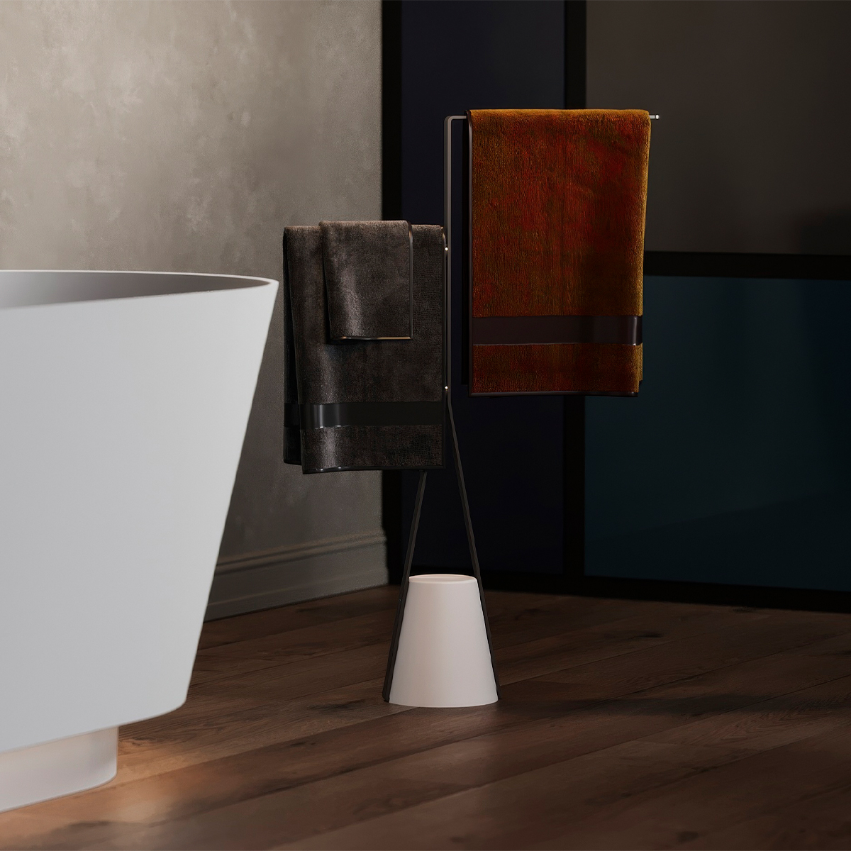 Дизайнерский металлический каркас полотенцедержателя выполнен из стальных элементов толщиной 2 мм, обеспечивающих прочность, долговечность и устойчивость к нагрузкам. Благодаря специальной технологии покрытия металл полностью защищен от коррозии, что особенно важно для влажной среды ванной комнаты.