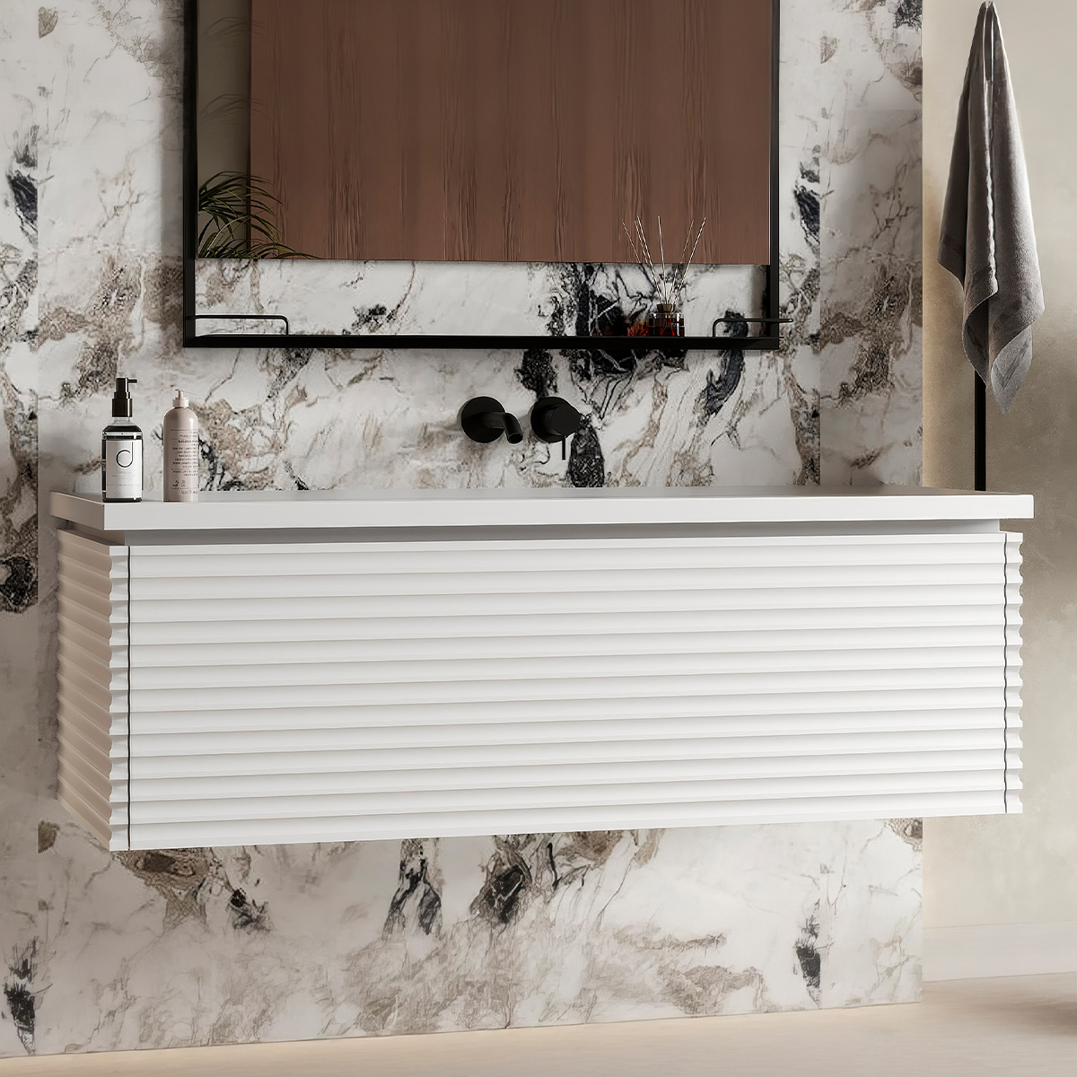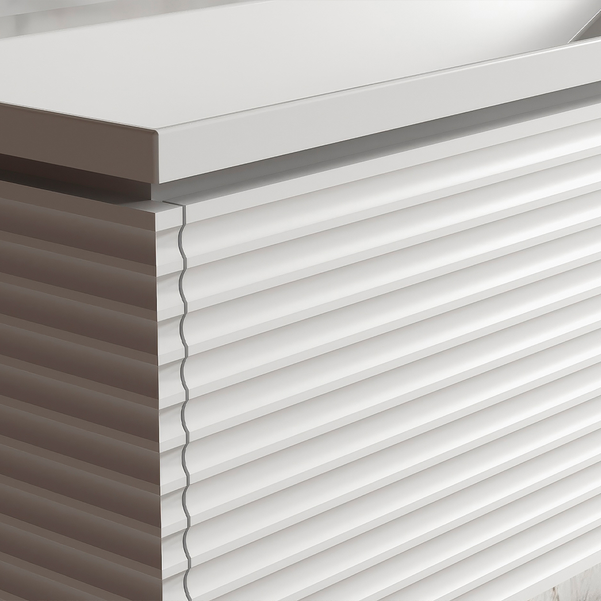 Эксклюзивные фасады с глубокой горизонтальной фрезеровкой подчеркивают элегантность и уникальность мебели. Фасады и боковины выполнены из высококачественного МДФ и окрашены матовой эмалью. 5-слойное покрытие увеличивает влагостойкость и срок службы изделий.