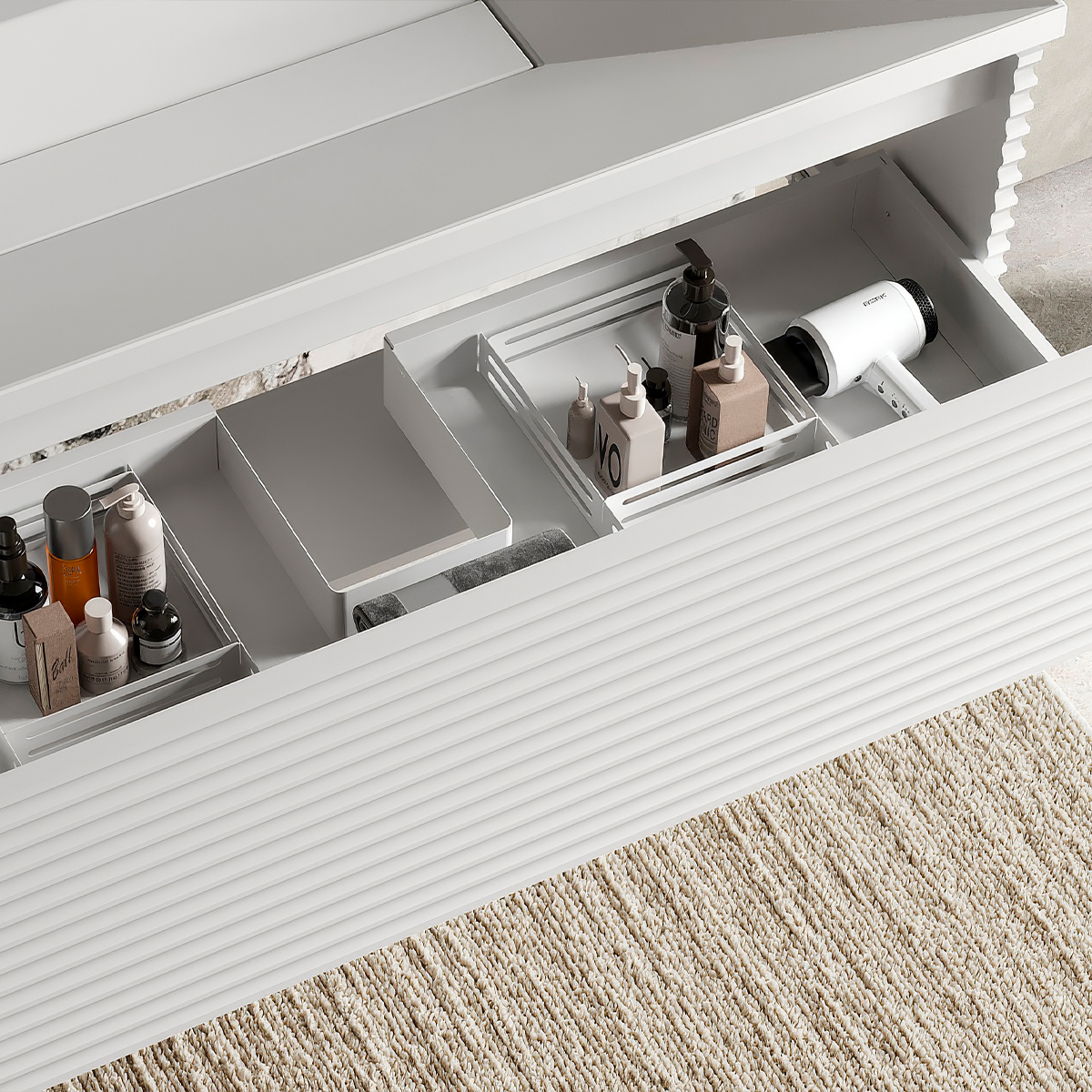 В изделиях коллекции Челси используется один из самых инновационных способов открытия/закрытия ящиков, а именно Push-to-Open, что выгодно отличает их от массовых изделий, и является прерогативой эксклюзивных и премиальных сегментов мебели для современных интерьеров ванной комнаты.