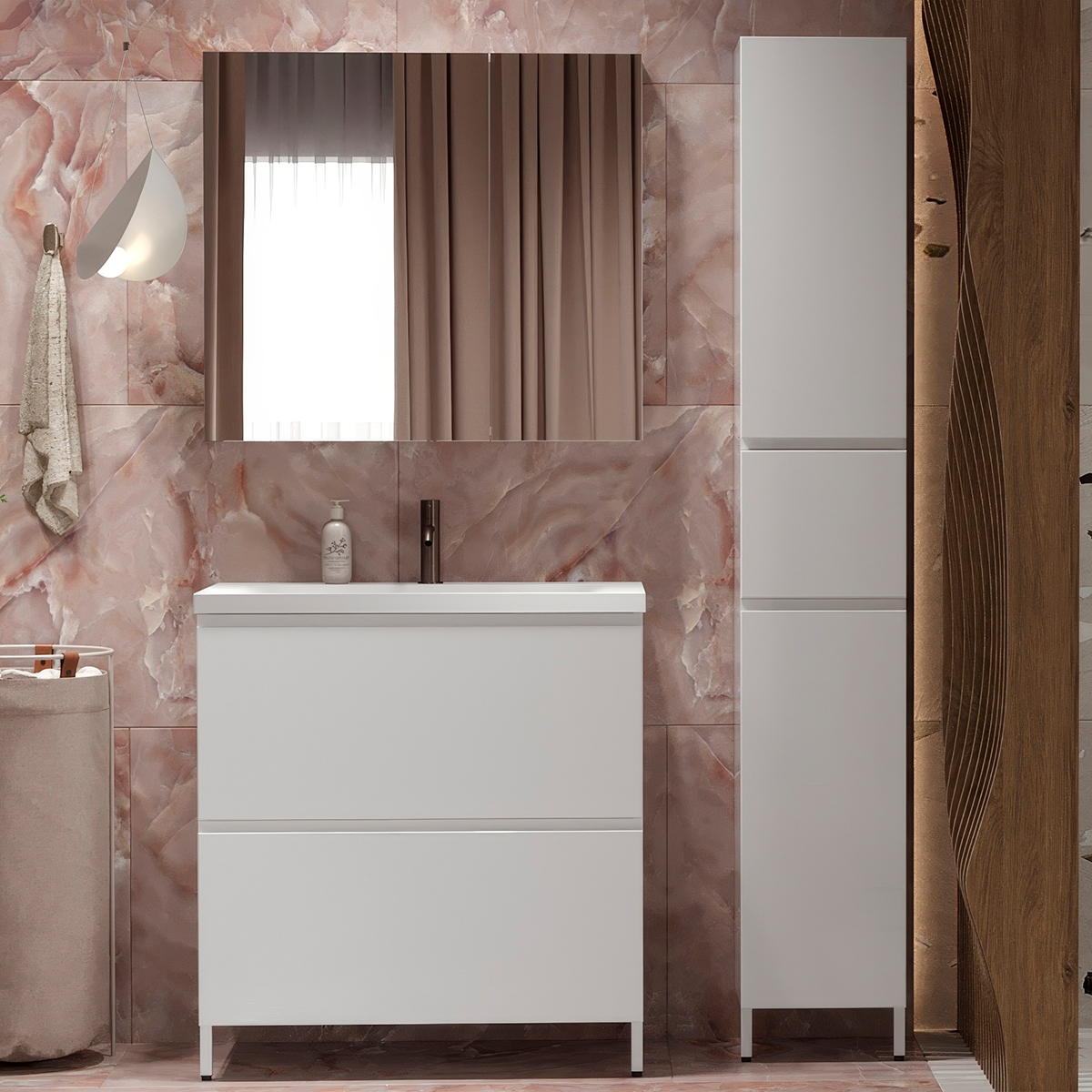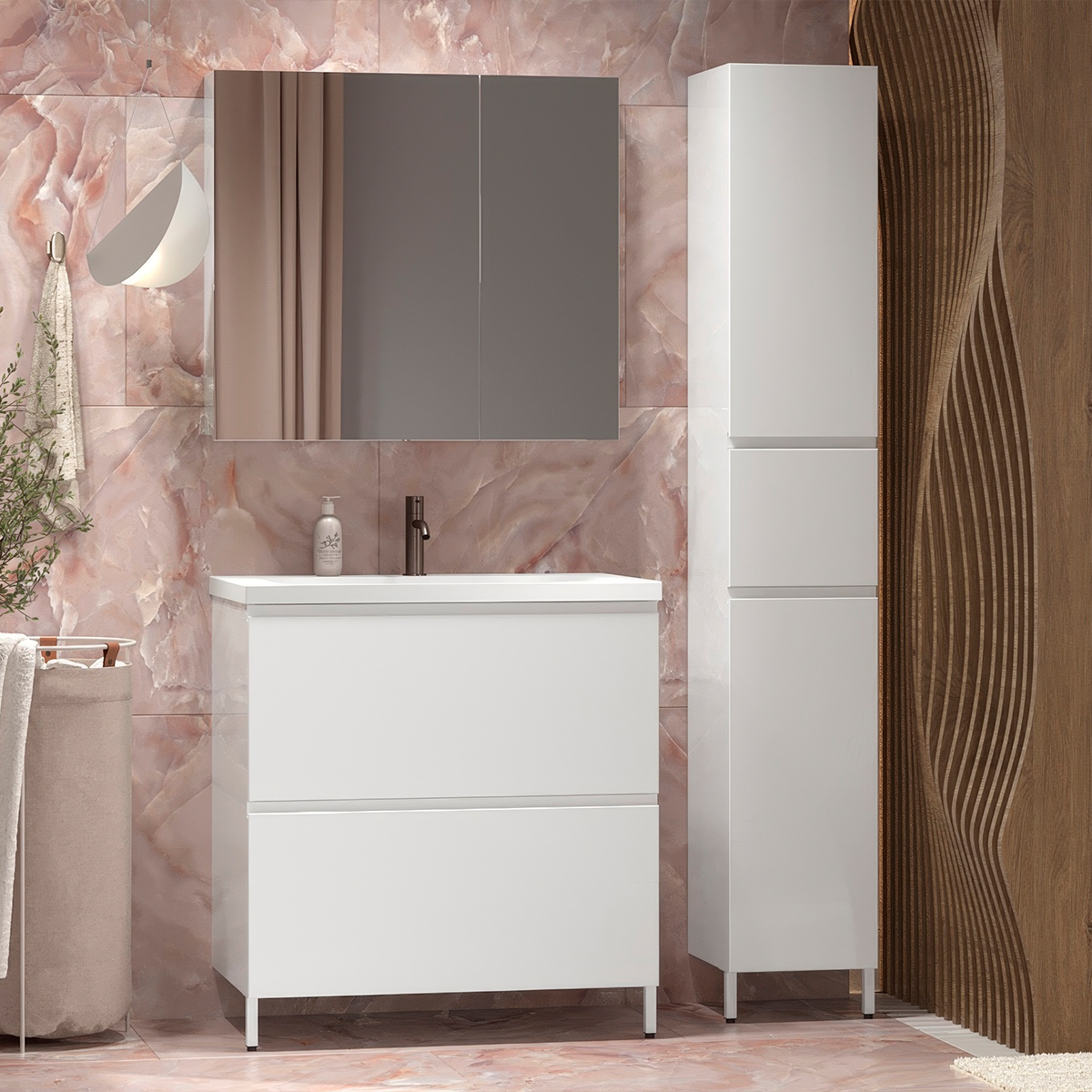 Наличие в коллекции тумбы и шкафа позволяет сделать интерьер гармоничным и завершенным.