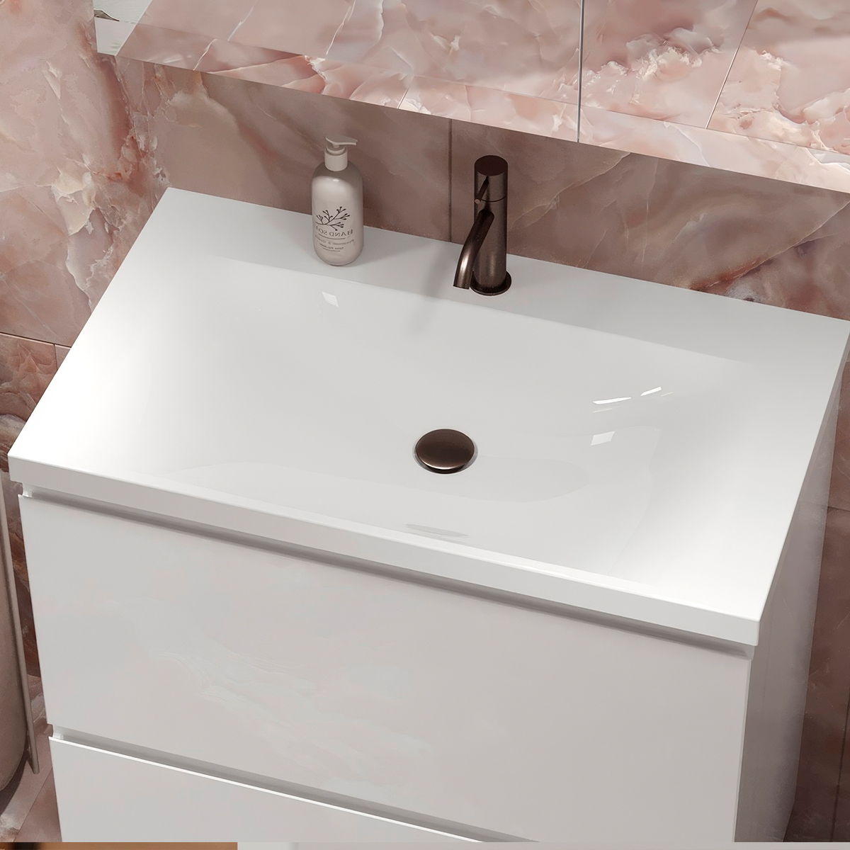 Тумбы Минск комплектуются умывальниками Порто BELUX, которые изготовлены из премиального материала COMPOSITE TITAN — усовершенствованная командой BELUX формула искусственного мрамора.