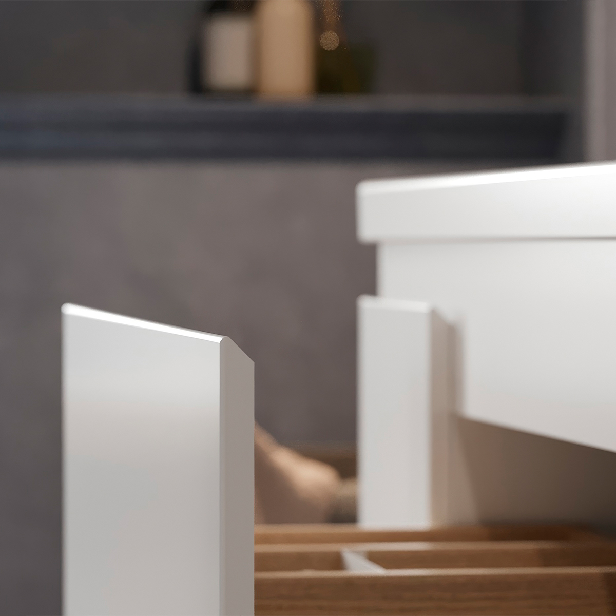 Ручки на фасадах интегрированы, выполнены специальной фрезеровкой. Они просты в ежедневном уходе и функциональны.