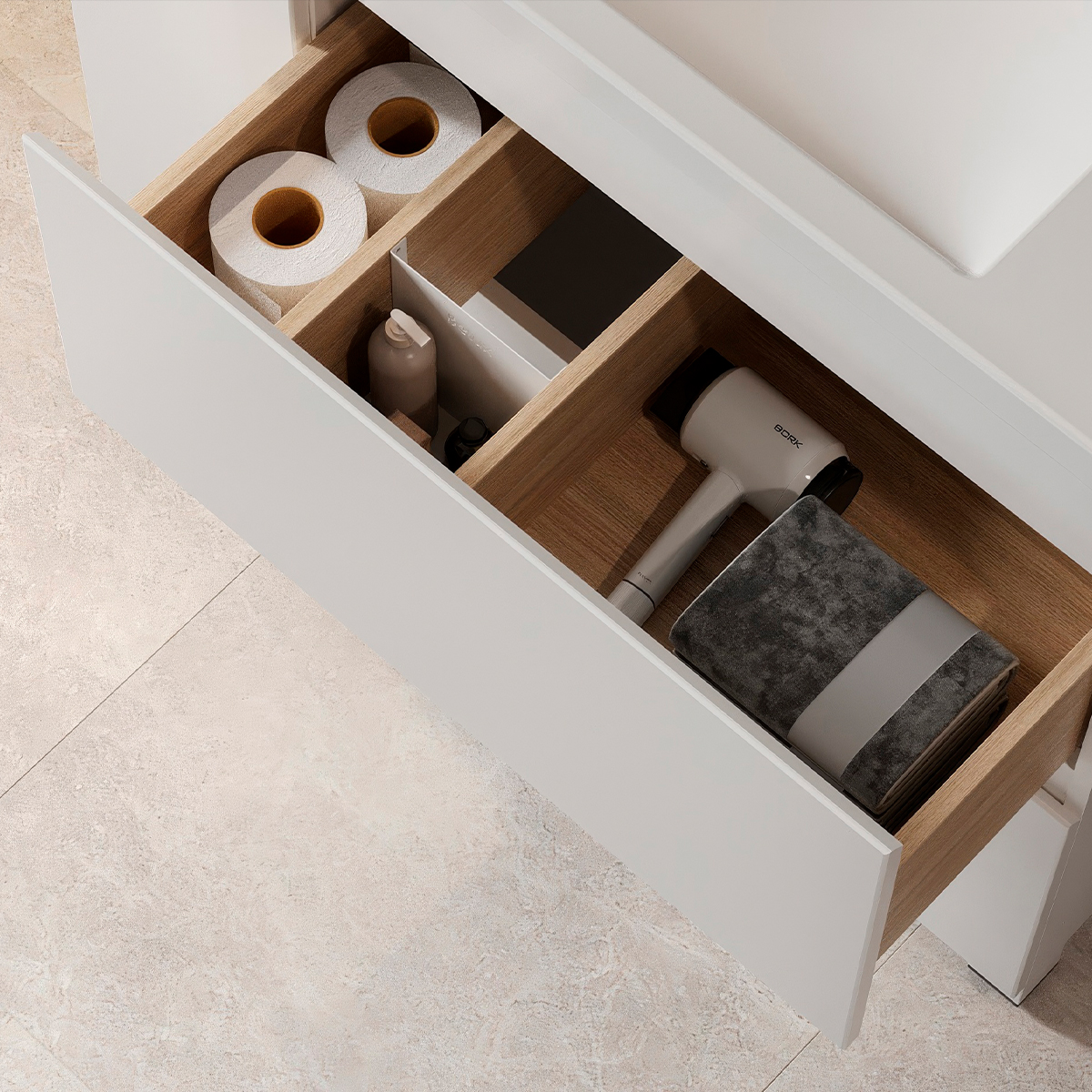 Внутренние ящики выполнены из ЛДСП производства EGGER. Использование высококачественного ЛДСП производства EGGER, а также PUR-клея для оклейки кромкой обеспечивают высокие эксплуатационные характеристики. Плавное закрытие ящиков обеспечивают высококачественные направляющие с доводчиками.
