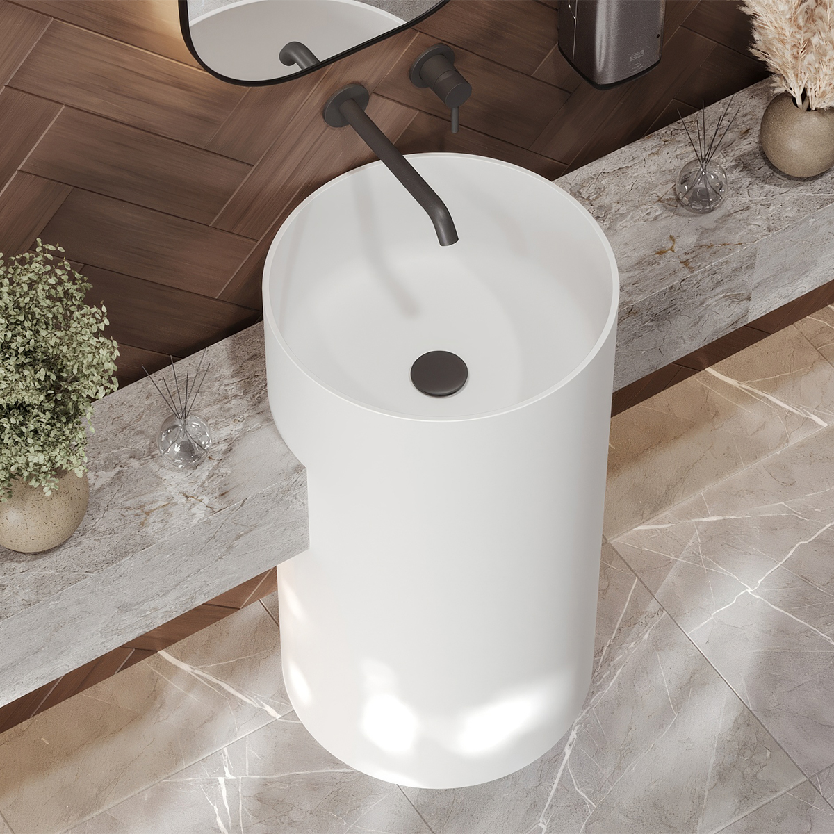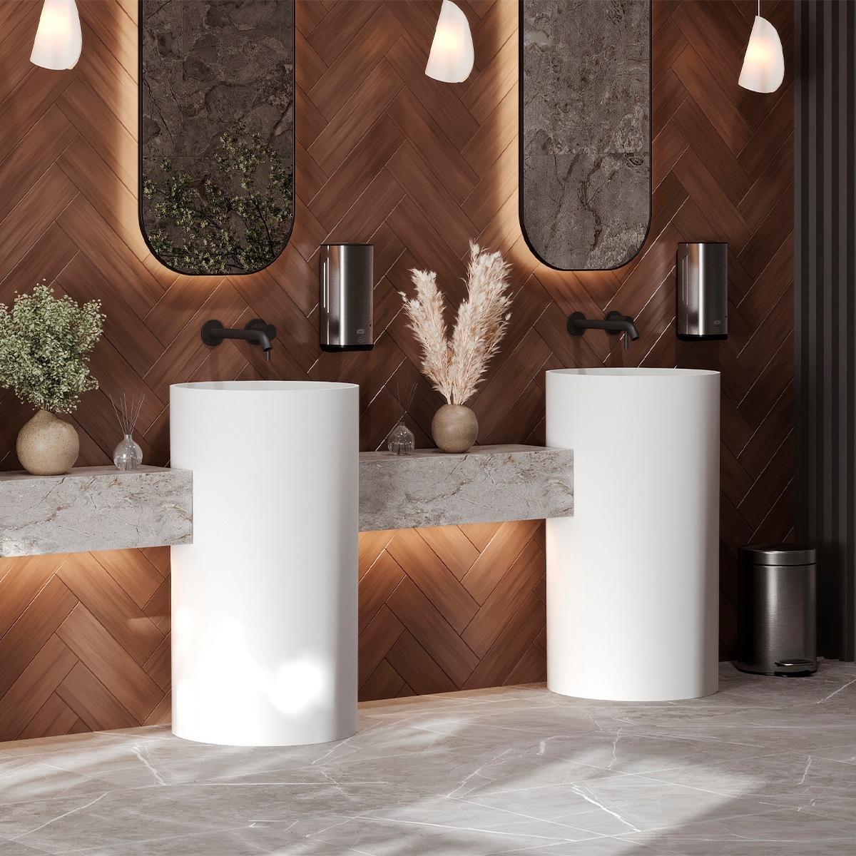 Напольные умывальники — это стильное и современное решение для ванной комнаты, где чаша и опора образуют единую конструкцию, которая опирается непосредственно на пол. Они идеально подходят для создания дизайнерского акцента в интерьере.
