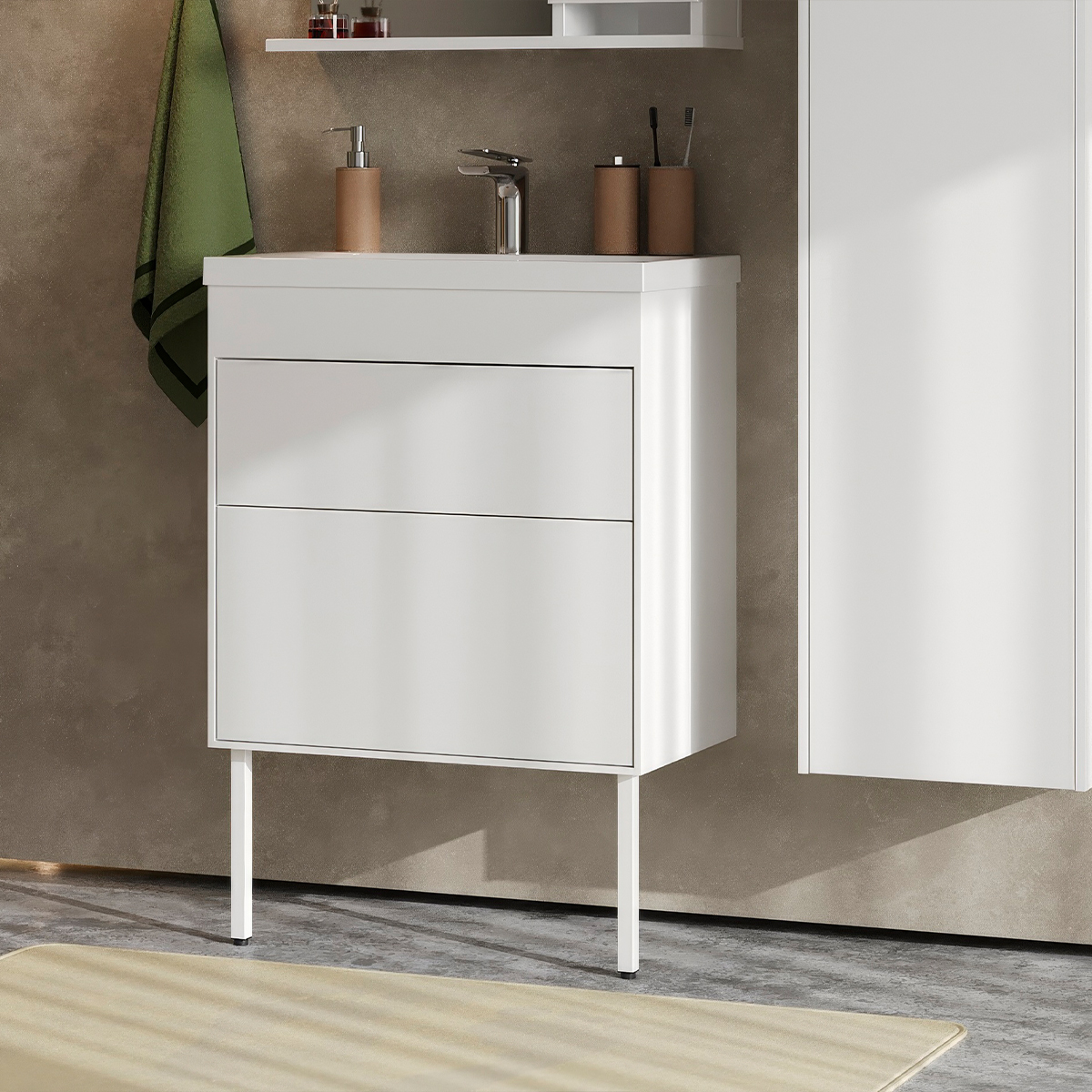 В комплект с тумбой входят также белые ножки, которые покупатель может установить по своему желанию. Ножки подчеркнут изящность исполнения мебели.