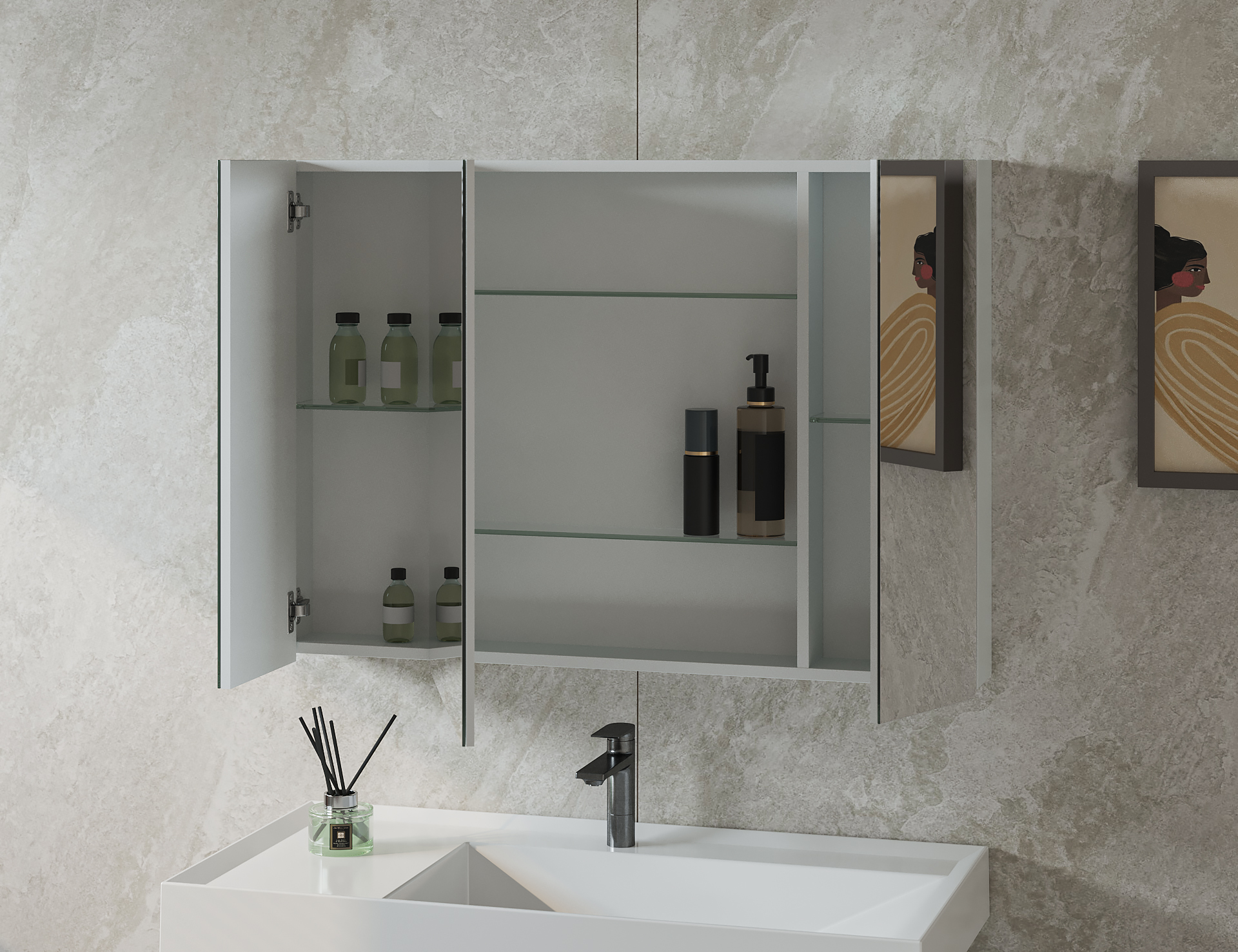 Элегантный зеркальный шкаф Триумф выигрышно будет смотреться в ванной комнате в стиле Hi-Tech. Такой интерьер любит строгие линии, минимализм декора и многофункциональность.