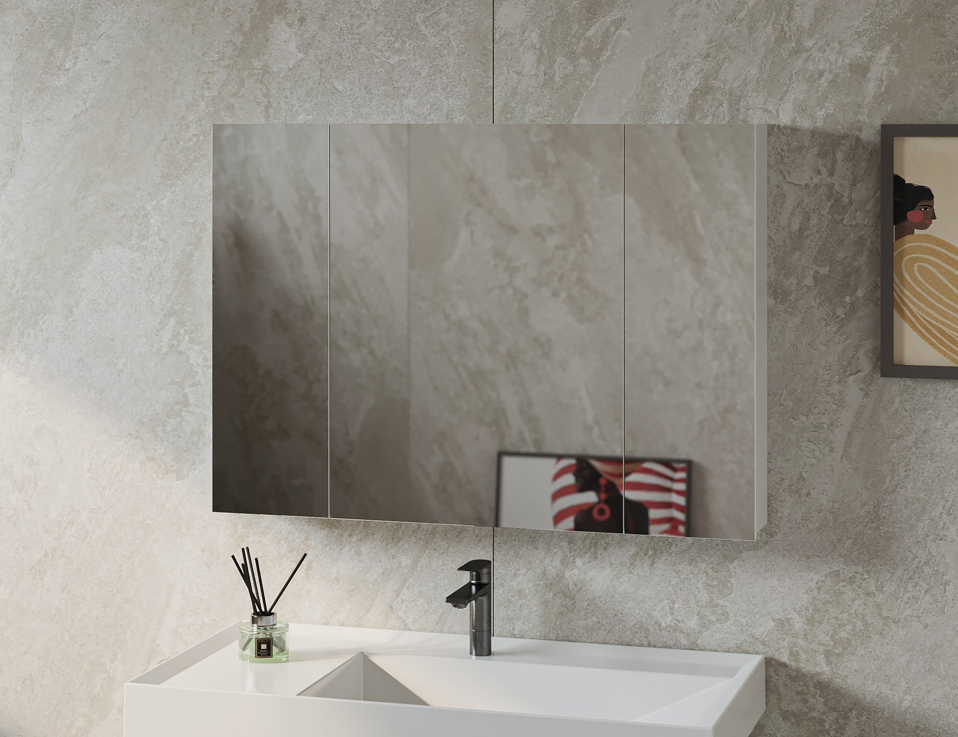 Зеркальный шкаф зрительно расширяет пространство, а также вносит в общую композицию легкость и невесомость.