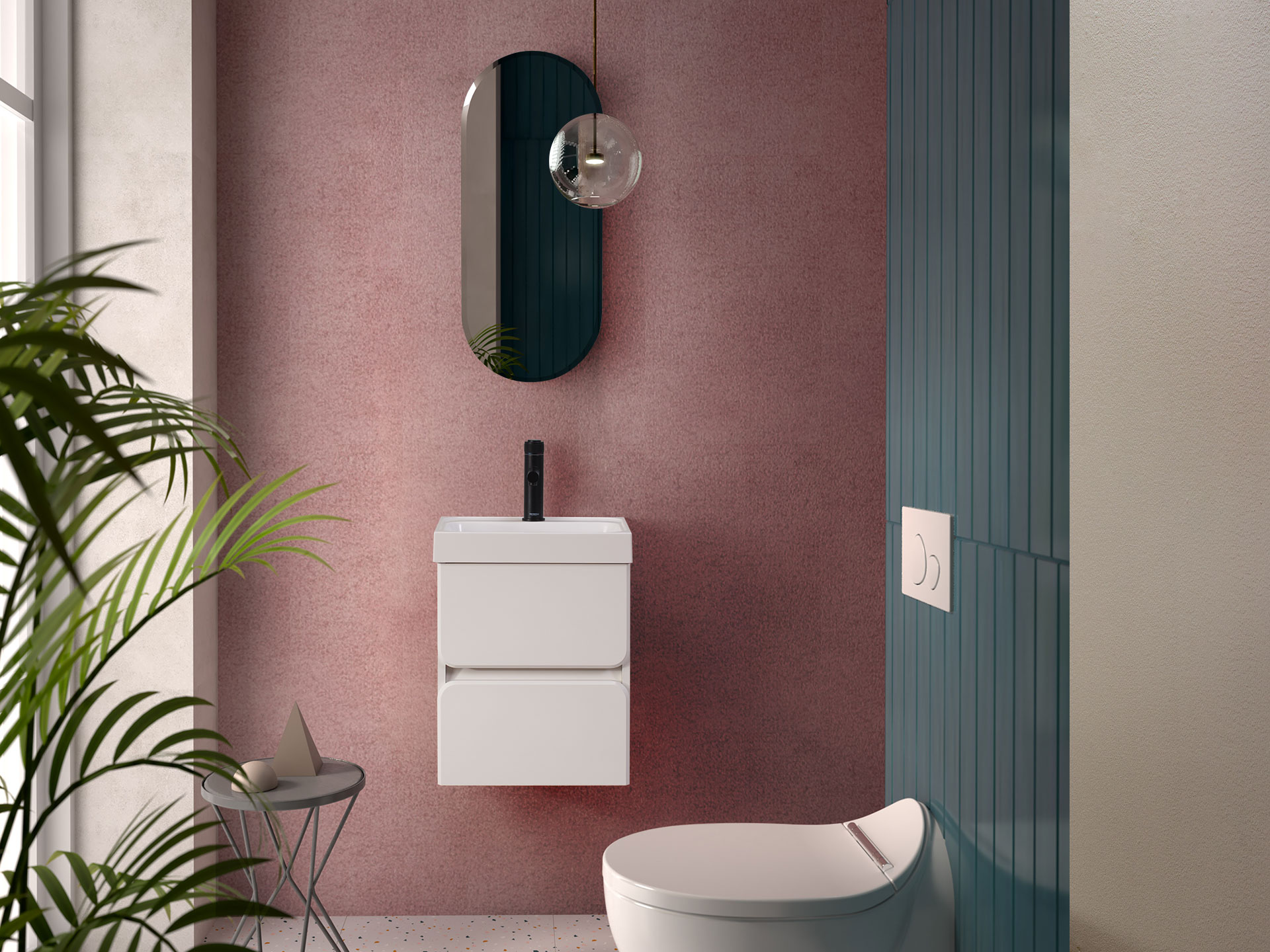 Современный простой стиль с оригинальными цветовыми решениями для малогабаритных ванных комнат. Свободное исполнение композиции позволяет адаптировать её для любой ванной комнаты. Комфорт и строгость являются наиболее выразительными свойствами.