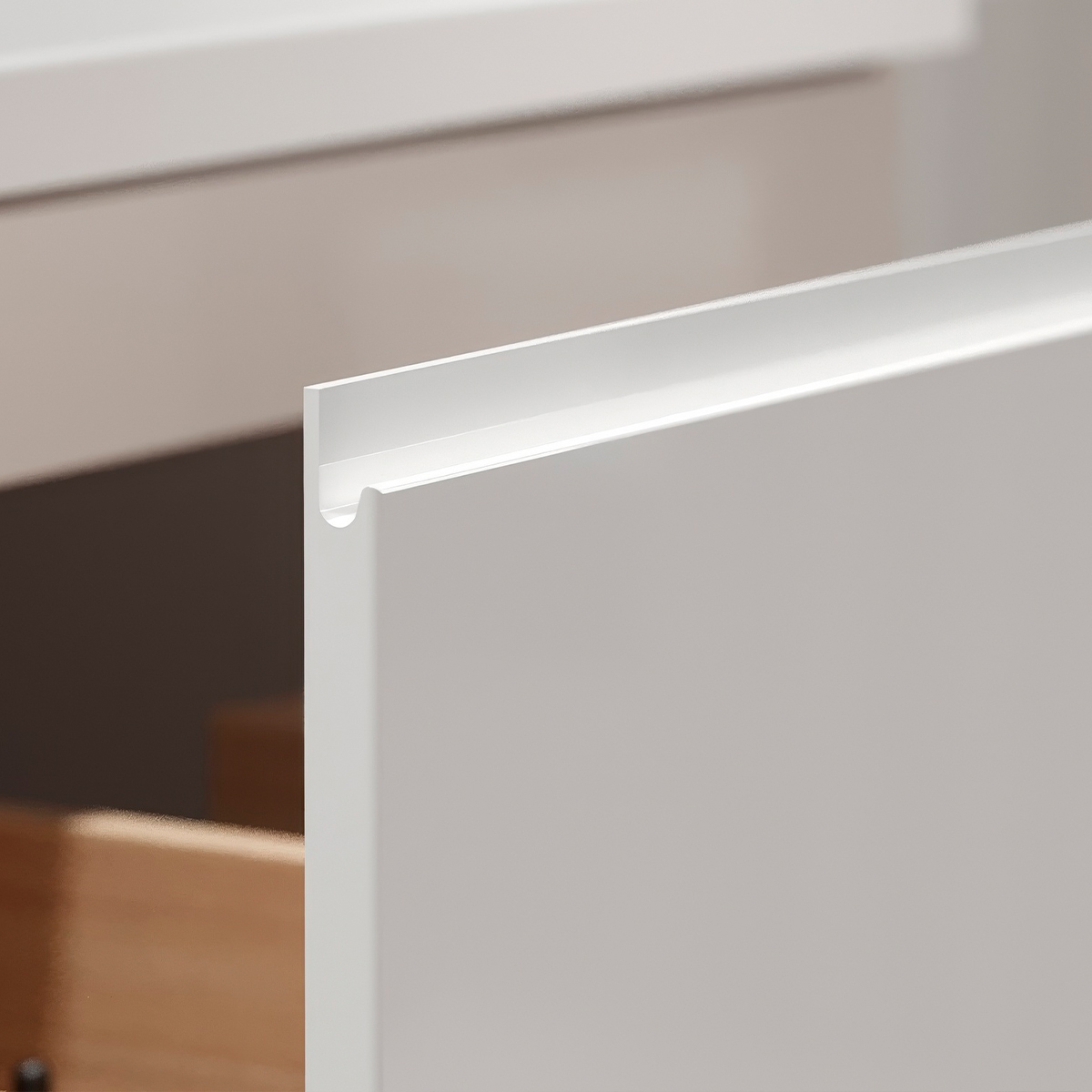 Ручки на фасадах интегрированы, выполнены специальной фрезеровкой. Они просты в ежедневном уходе и функциональны.