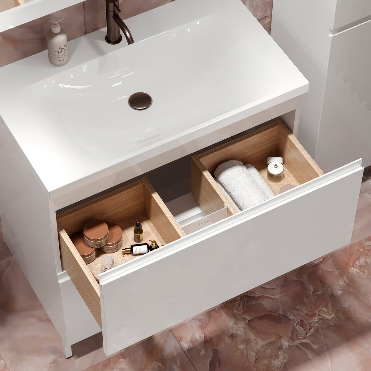 Тумбы Минск комплектуются умывальниками Порто BELUX, которые изготовлены из премиального материала COMPOSITE TITAN — усовершенствованная командой BELUX формула искусственного мрамора.