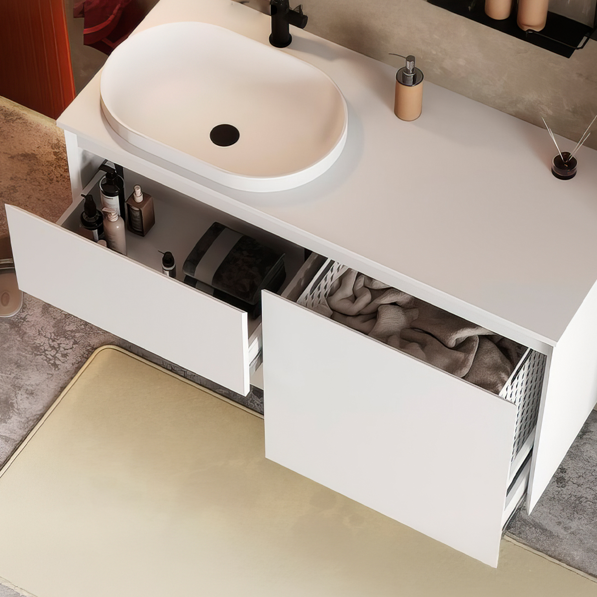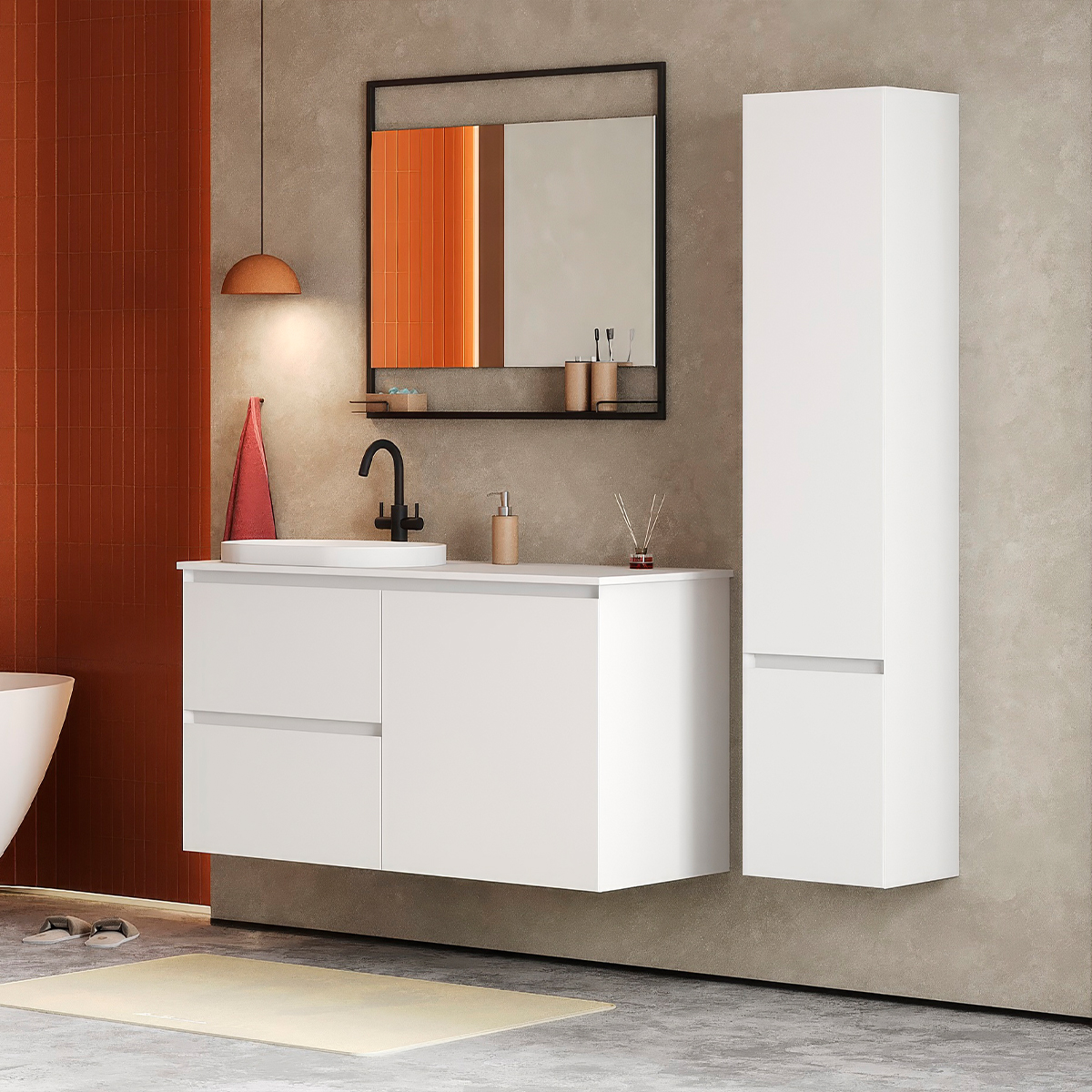 Фасады и боковины тумб скошены под углом 45 градусов. Такое решение придает мебели утонченный внешний вид и улучшает эргономику. И фасад, и корпус мебели покрыты матовой эмалью и изготовлены из высококачественного МДФ производства EGGER, что обеспечивает высокую влагостойкость и долговечность конструкции.