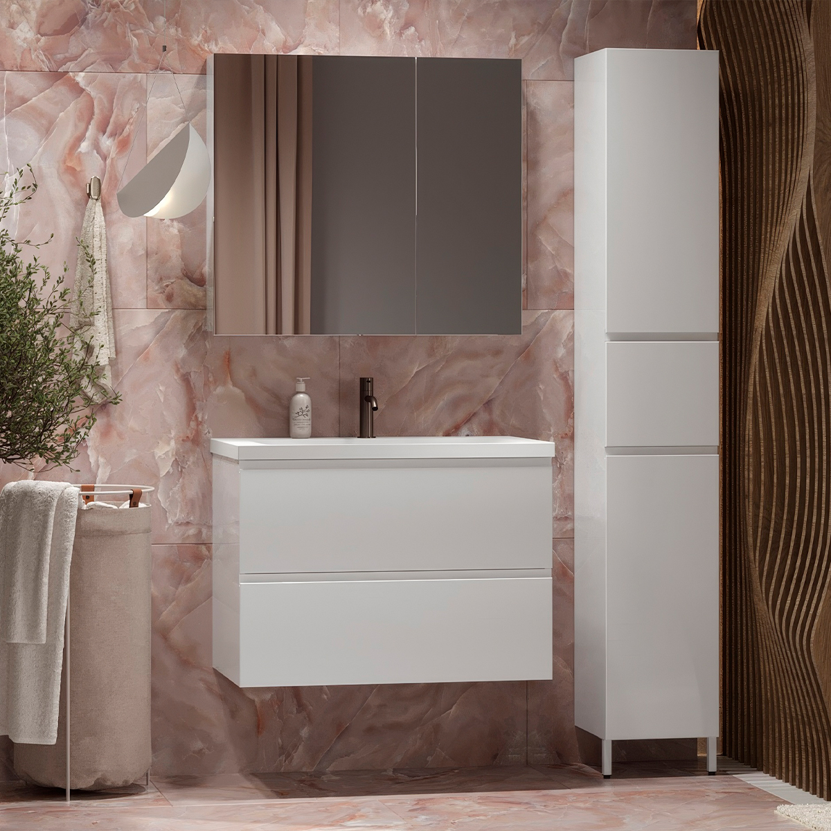 Наличие в коллекции тумбы и шкафа позволяет сделать интерьер гармоничным и завершенным.