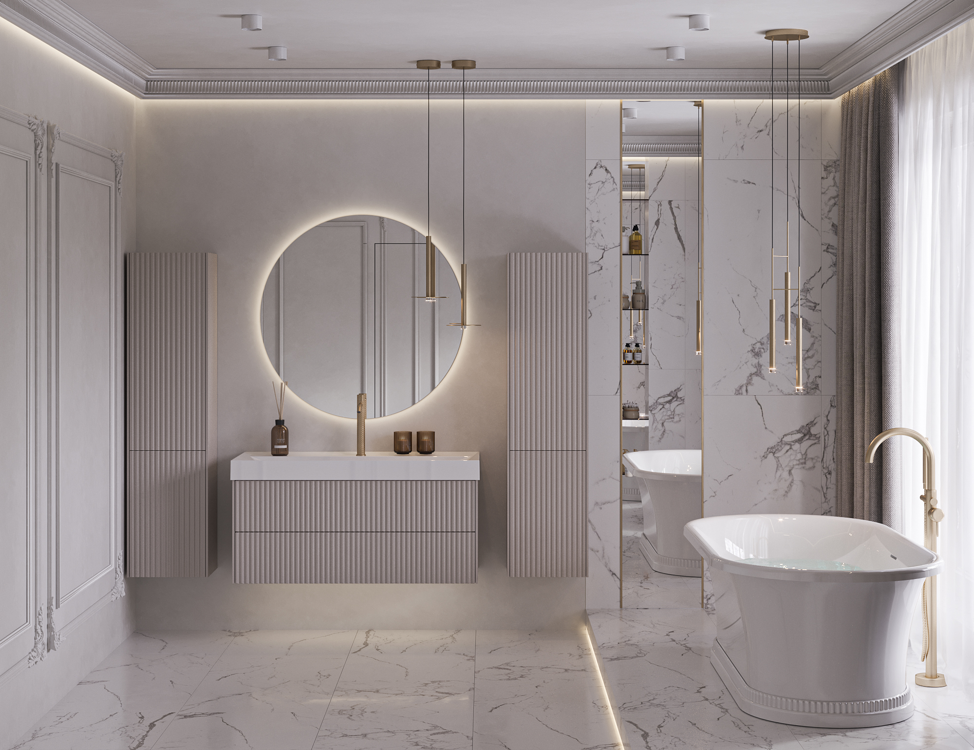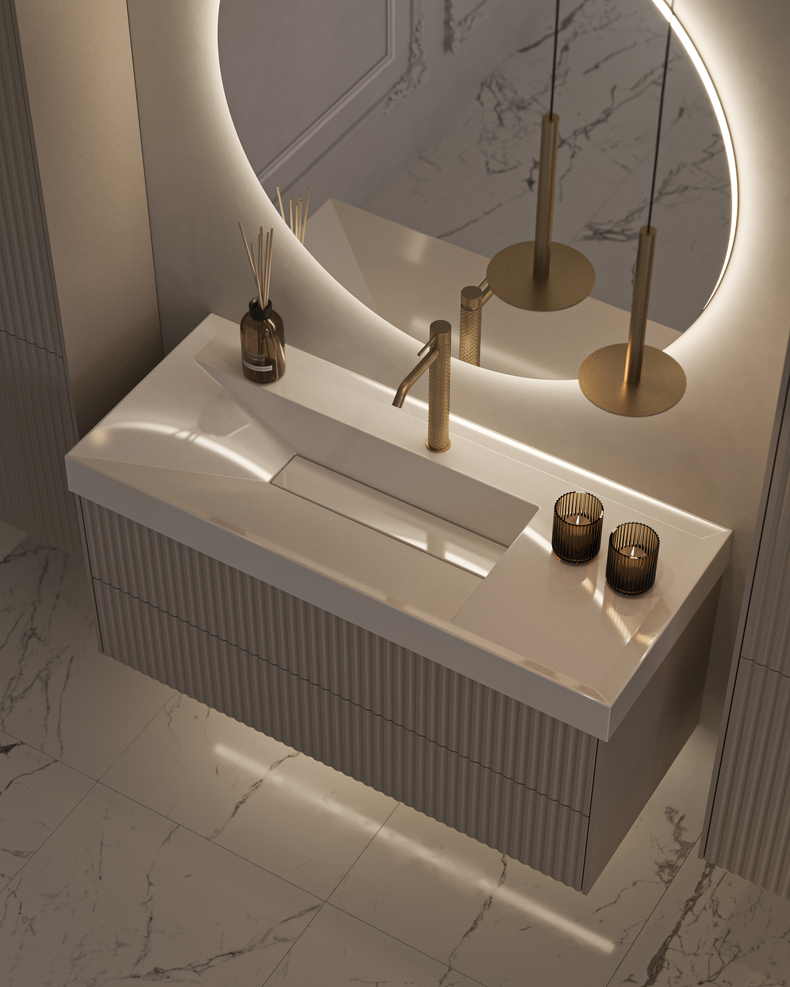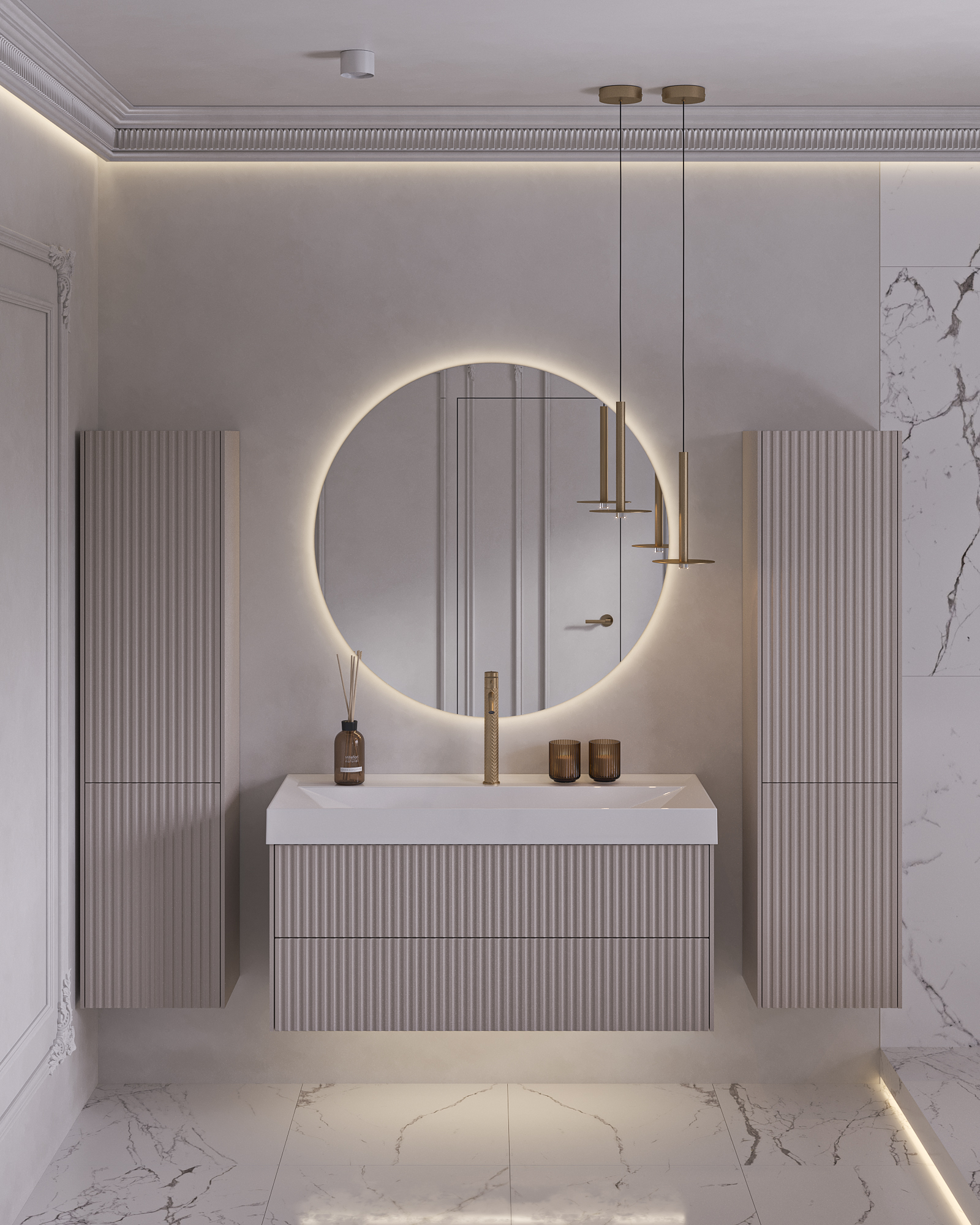 5. Современные технологии: Зеркала с подсветкой и встроенные системы хранения делают использование мебели ещё более удобным.