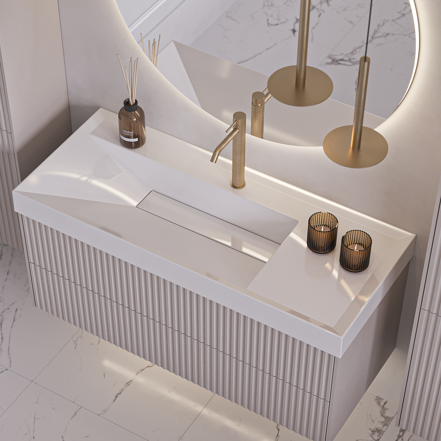 Умывальники шириной 85, 100 и 120 см предлагаются с центральным, левым и правым расположением чаши. Умывальники с удобными полками справа/слева придают практичности и удобство в использовании.